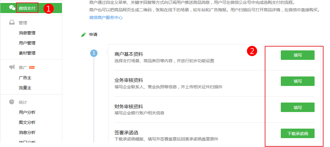 1、依次点击 微信支付-》填写申请资料