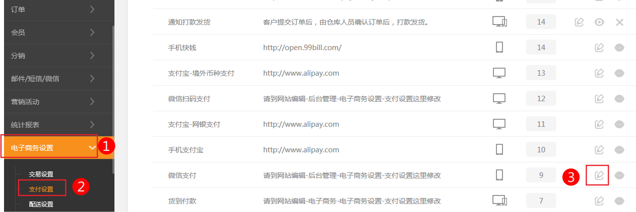 2.后台-》电子商务设置-》支付设置-》微信支付点击编辑。