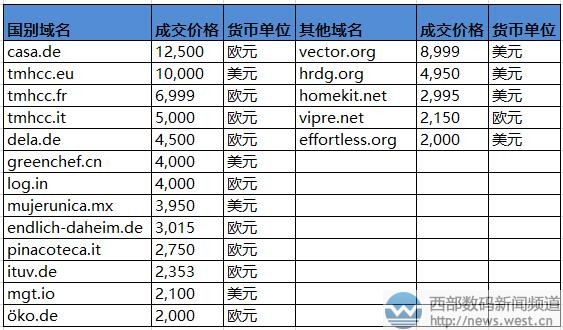 国别域名方面,德国域名casa.de以12,500欧元排在第一,约合人民币9.2万元。该域名属于CVCV型域名,品相较好,简单好记,含义上又有“房屋”之意,应用价值较高。目前就有fendi casa家具与之对应。