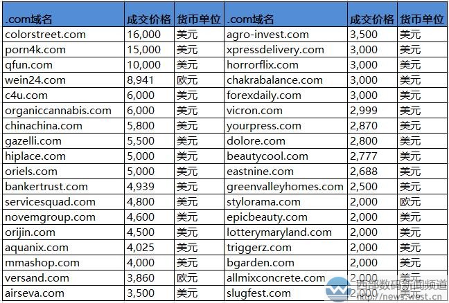 除此以外,两字母+数字的组合域名wein24.com和c4u.com分别以8941欧元和6000美元成交,随后“中国中国”域名chinachina.com也以5800美元的价格榜上有名。