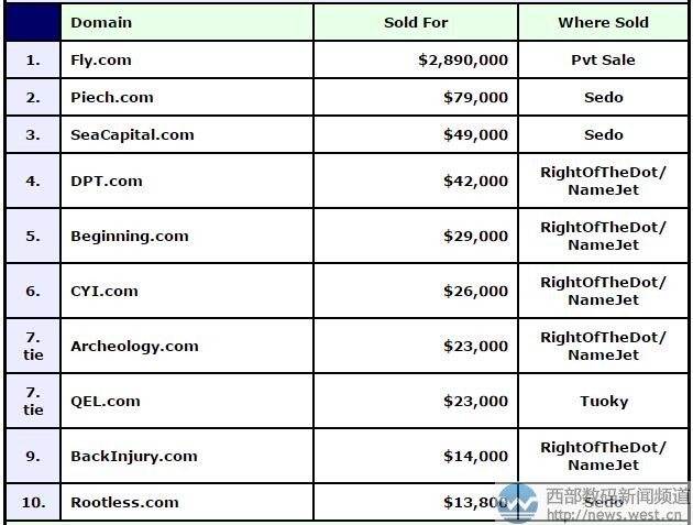 超越两数字01.com!域名fly.com以1991万元领跑DN榜西部数码(west.cn)5月4日消息,本期的DN交易榜(4.24-4.30)上,虽然短字符域名和单词域名各有千秋,但榜单的冠军宝座却被极为短小精湛的单词域名fly.com以2,890,000美元的高价摘得,约合人民币1991万元。这也是目前为止,今年DN榜上成交价最高的域名,甚至超过以1,820,000美元成交的01.COM。