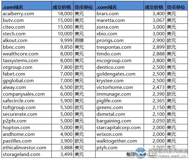 西部数码(west.cn)7月12日消息,最新一期的sedo交易榜出炉,本期上榜的域名共有56个,其中卖价最贵的是英文域名acaiberry.com,成交价为18,000美元,约合人民币12万元。