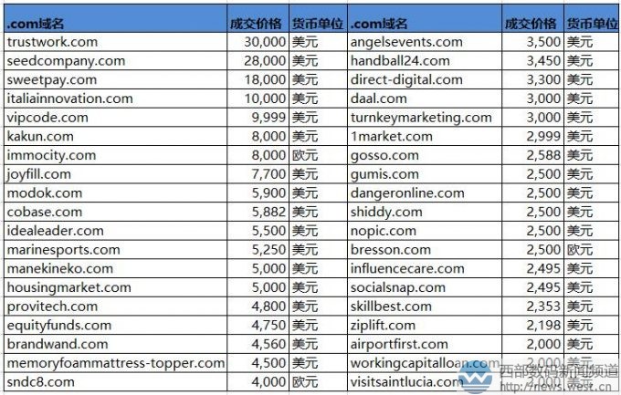 西部数码(west.cn)7月19日消息,最新一期的sedo交易榜出炉,本期上榜的域名共有65个,其中卖价最贵的是英文域名trustwork.com,成交价为30,000美元,约合人民币20万元。