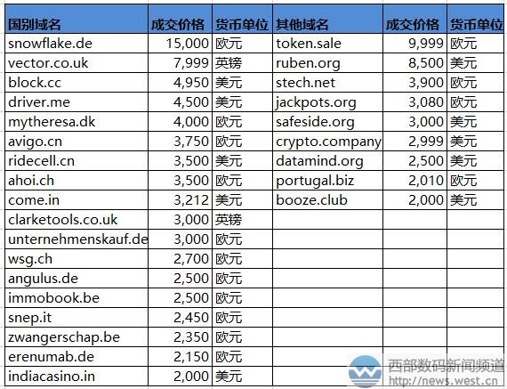 其他域名方面,本期三枚新顶级域名榜上有名。其中,token.sale有“代币销售”的意思,很适合搭建虚拟货币电商类平台,成交价为9,999欧元,约合人民币8万元。同样适合虚拟货币领域的还有域名crypto.company,成交价为2,999美元,该域名有“加密公司”的意思,可用于加密货币平台。除此以外,新顶级域名booze.club也以2000美元的结拍价上榜。