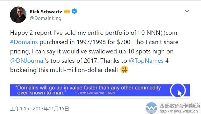 “域名大王”Rick一连出售10个三数字域名!美图收购 “青年会所”域名西部数码(west.cn)11月21日消息,据namepros在论坛曝料称,近日知名投资大佬“域名大王”Rick Schwartz出售了包括346.com、348.com等在内的10个三数字域名,交易总额达数百万美元。与此同时,美图秀秀公司拿下了英文组合域名PartyNow.com。