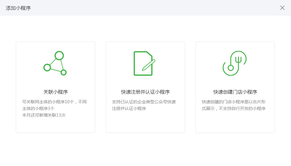 2. 一个公众号可关联10个同主体的小程序,3个不同主体的小程序。