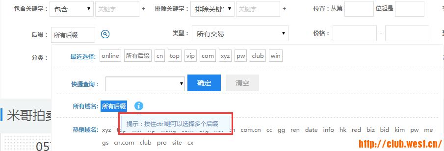 ④域名交易和管理的后缀筛选功能已优化,按住ctrl即可选择多个后缀!