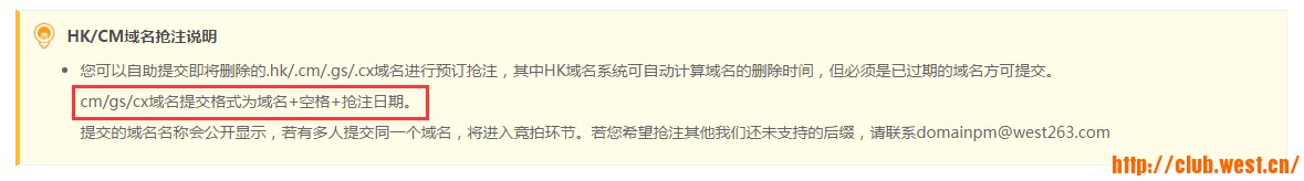 ②.gs/.cx域名已支持自主预定了,提交格式为:域名+空格+抢注日期。立即提交预定